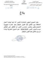 أصدر المجمع المهني المشترك للتمور بيانا بتاريخ 20 أكتوبر، أعلن من خلاله أنه تم الاتفاق على انطلاق موسم تصدير التمور نحو السوق المغربية بداية من الاثنين 20 أكتوبر.