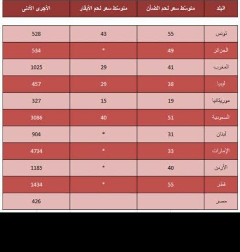 جدول يبيّن أسعار اللحوم بدول شمال إفريقيا وبعض الدول العربية مقابل الأجور الدنيا بالدينار التونسي